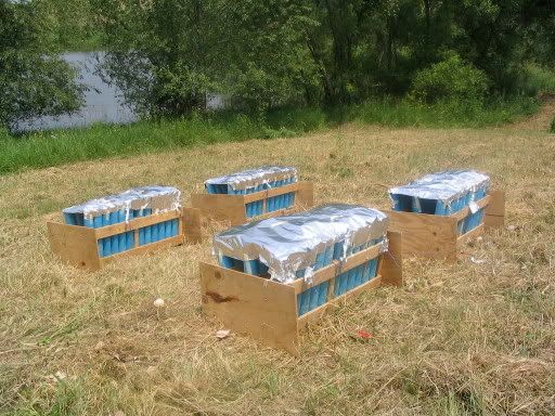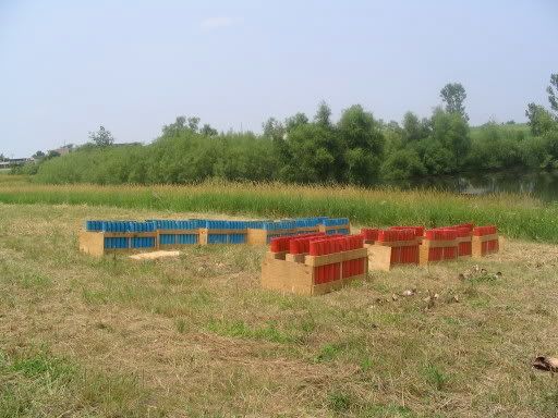 Here's the three and four-inch shell racks set up in the field. This field really worried us because of all the recently-cut dry grass lying around. Fortunately, we only had a few small fires while shooting.